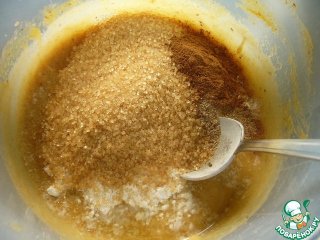 Добавить крахмал, сахар, корицу, имбирь, ванилин, мускатный орех