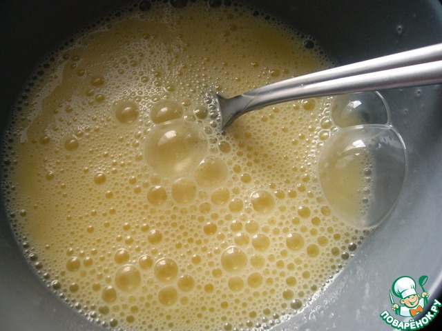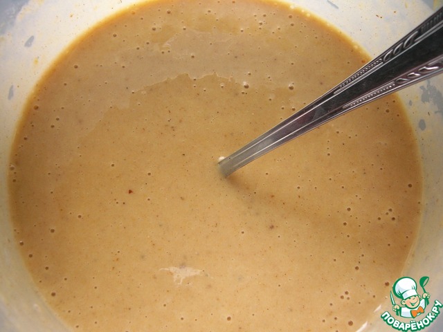 Перемешать ложкой до однородности. Влить молоко-перемешать.