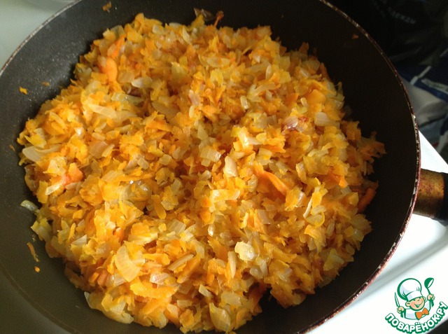 В блюдо, где будем делать начинку, выкладываем рис, тушеную морковь с луком и специи, перемешиваем.