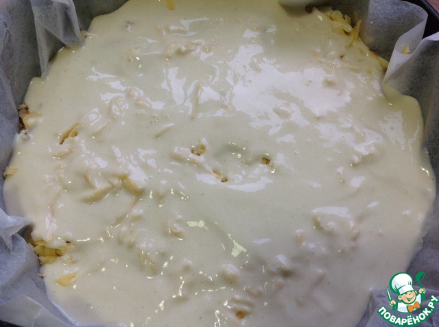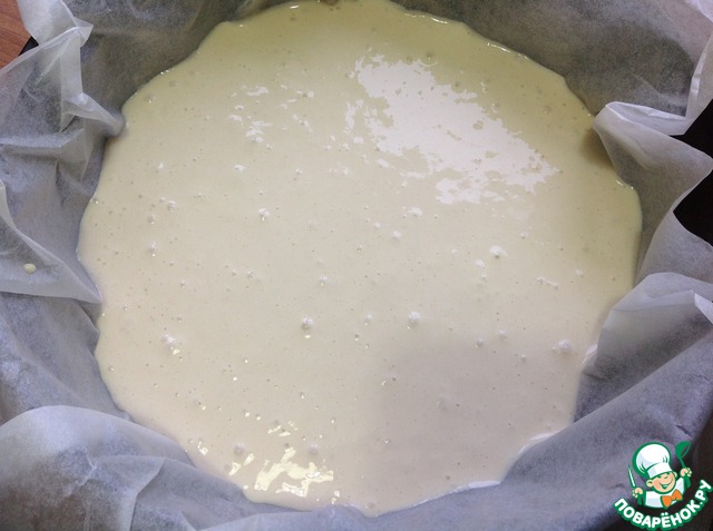 В форму, выстеленную пекарской бумагой, выливаем половину теста.