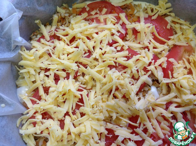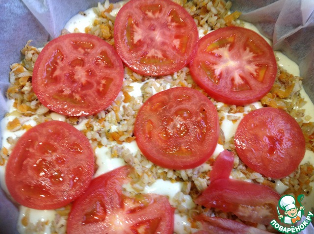 Сверху помидоры, порезанные кружочками.