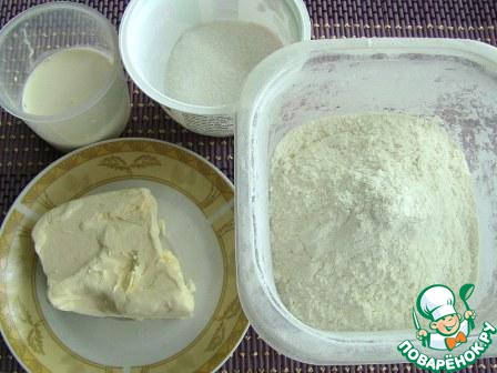 Пока тыква печется, готовим тесто, для этого нам нужна мука, сахар, молоко и сливочное масло. Охлажденное сливочное масло нарезаем кубиками, перемешиваем с мукой, растираем в крошку. Добавляем холодное молоко и сахар, быстро замешиваем тесто.