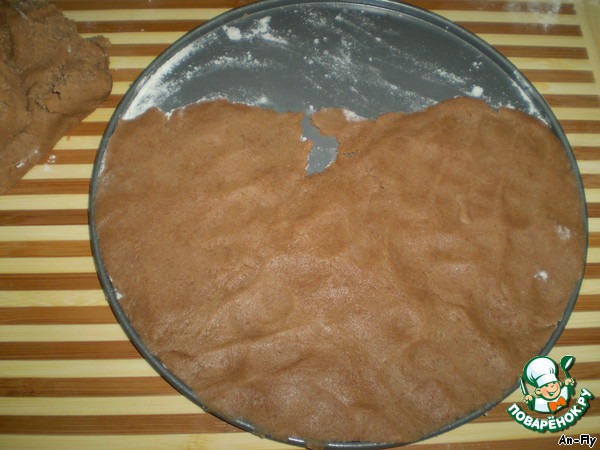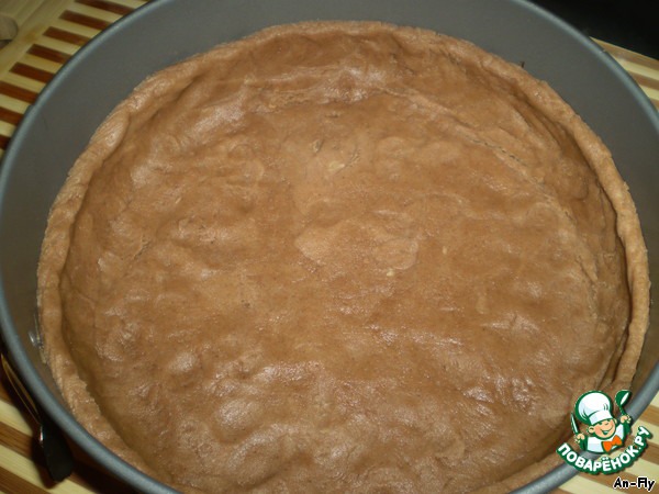 Возьмите разъемную форму ср.размера, достаньте дно, присыпьте мукой и, отрывая от теста небольшие кусочки, выложите ими дно формы.