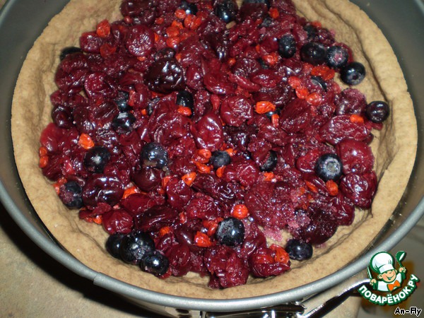 На остывший корж выложите хорошо отжатые ягоды, а стекший сок~3ст.л. оставьте для творожной начинки (по желанию).