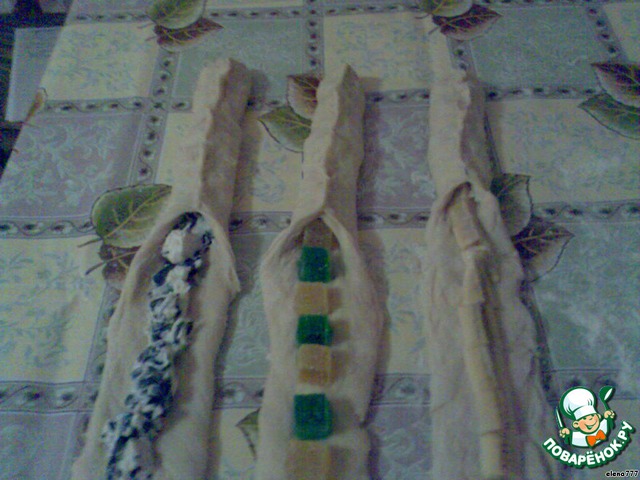 Теперь на каждый жгутик кладём начинку, на первый - размятый глазированный сырок, на второй - порезанный мармелад, на третий - порезанный банан. Края защипываем. Начинку можете ложить на свой вкус - яблоки, изюм, курагу, орехи и т.д., вообщем - у кого что есть и кому что нравится.
