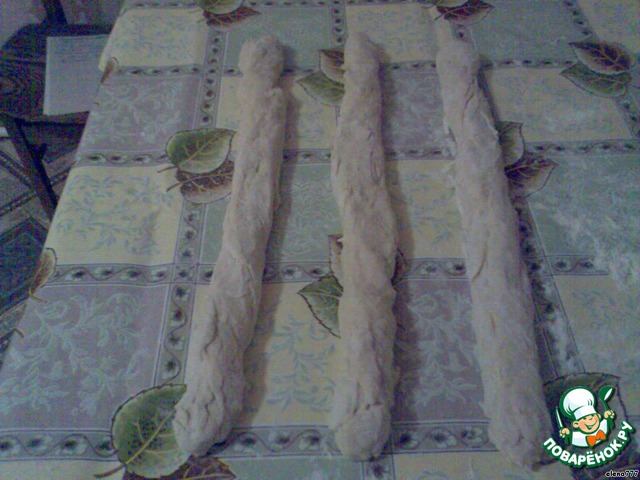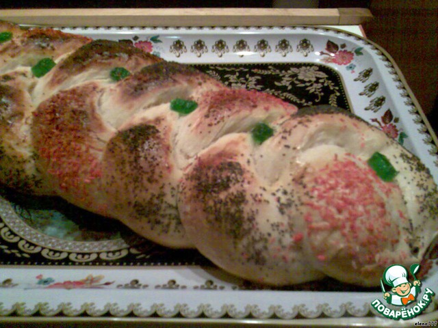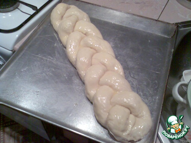 Теперь переложить прядки на смазанный противень, заплести в косу и смазать верх желтком, смешанным с растительным маслом.