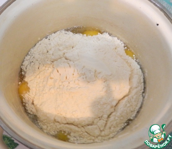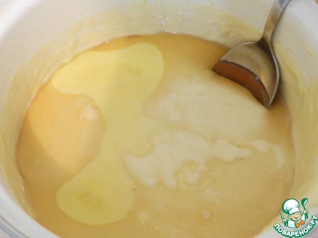 Добавляем в тесто оливковое масло и коньяк, тщательно перемешиваем.