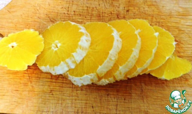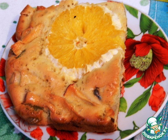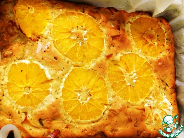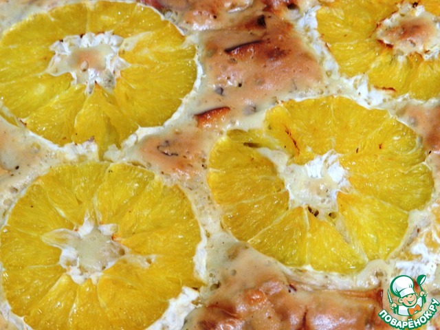 Выкладываем апельсин сверху. Отправляем пирог в разогретую духовку. Время выпекания зависит от духовки. Я поставила сначала на 180 градусов на час, потом прибавила температуру до 220 градусов ещё на полчаса.