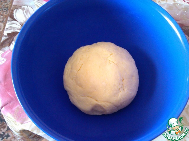 Тесто:творог смешать с сахаром и ванильным сахаром и солью. Я воспользовалась миксером. Постоянно помешивая, влить тонкой струйкой масло и молоко. Затем добавить желток. Муку просеять с разрыхлителем на творожную массу и замесить гладкое однородное тесто. Завернуть в пленку и положить в холодильник на 30 минут.