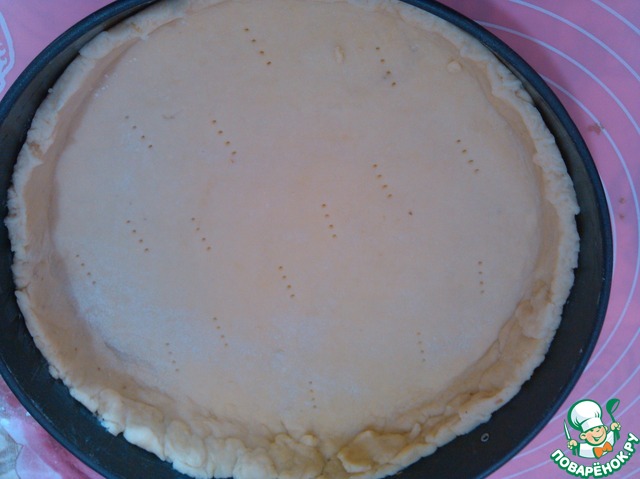 Духовку нагреть до 200 гр. Разьемную форму диаметром 26 см. смазать маслом и выложить в него раскатанное тесто, сделать бортики. Наколоть вилкой, чтобы оно при выпечке не выгибалось.