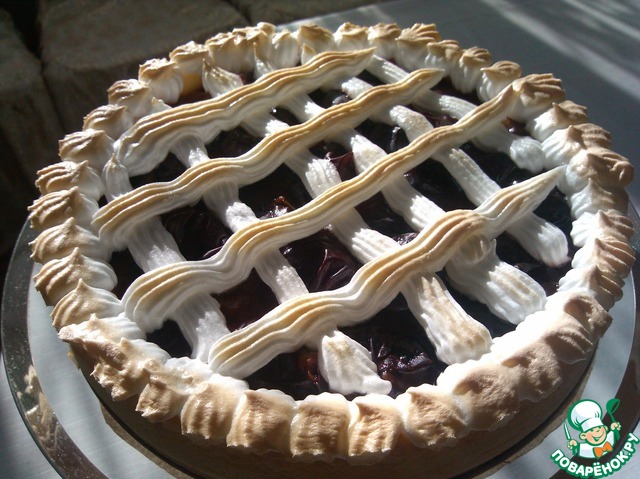 Выложить сливы. Белки взбить, постоянно всыпая сахар, до твердых пиков. Переложить в кондитерский мешок с звездообразной насадкой и выдавить на начинку в виде решетки. По краям сделать бордюр. Поставить пирог в духовку еще на 10 минут, пока безе не приобретет слегка бежевый цвет. Дать остыть, только затем убрать края формы.