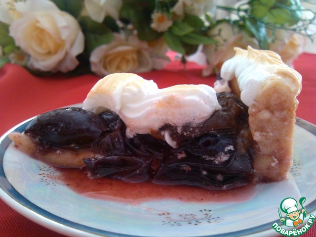 | Рецепт я увидела в журнале"Лиза" и сразу решила:приготовлю. Такое сочетание слив, джема и безе сулило бесконечное удовольствие! И я не ошиблась! Кисловатые сливы на подушке черничного джема под сладкой решеткой воздушного и нежного безе - действительно очень вкусно... |