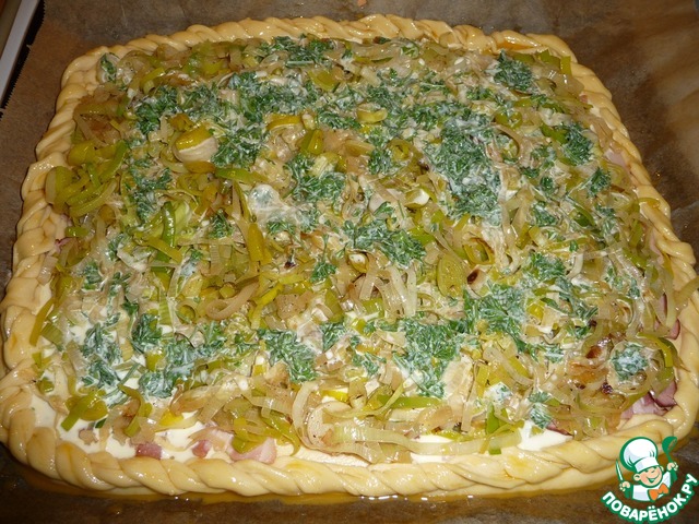 Открытый дрожжевой пирог с луком пореем и ветчиной