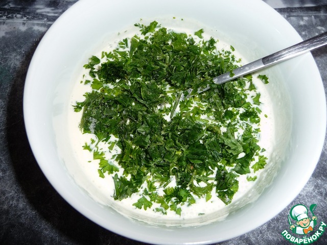 Готовим заливку. Для этого смешиваем сливки, сметану, зелень.