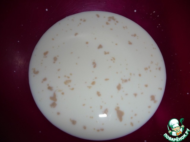 В теплое молоко разминаем дрожжи и, не размешивая, дайте постоять 5 – 7 минут, а затем добавьте 1 чайную ложку сахара и аккуратно размешайте до полного растворения дрожжей.