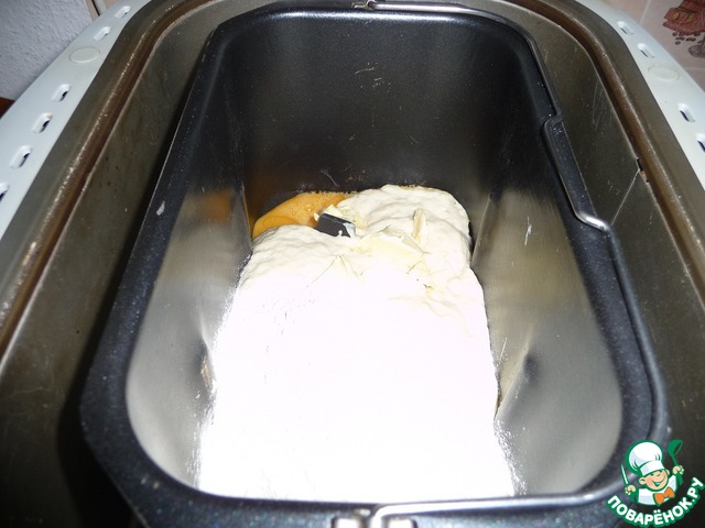 Тесто я замешиваю в хлебопечке. В емкость вбиваю яйцо, добавляю нашу опару, влить растительное масло, нарезать небольшими кусочками маргарин.