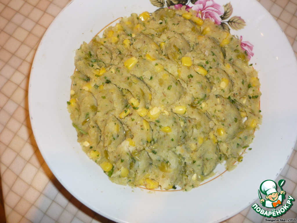 Картофель потолочь или натереть на крупной терке, добавить помятый вилкой горошек, кукурузу, специи, сок половинки лимона, нарезанную зелень кинзы и посолить по вкусу.