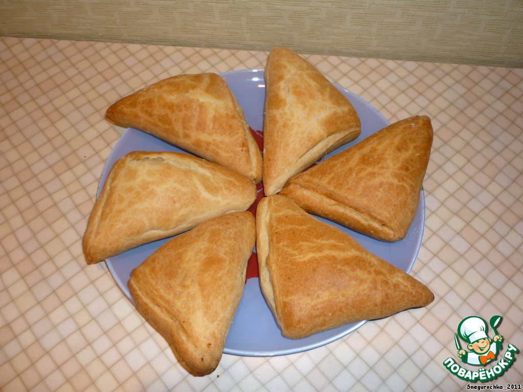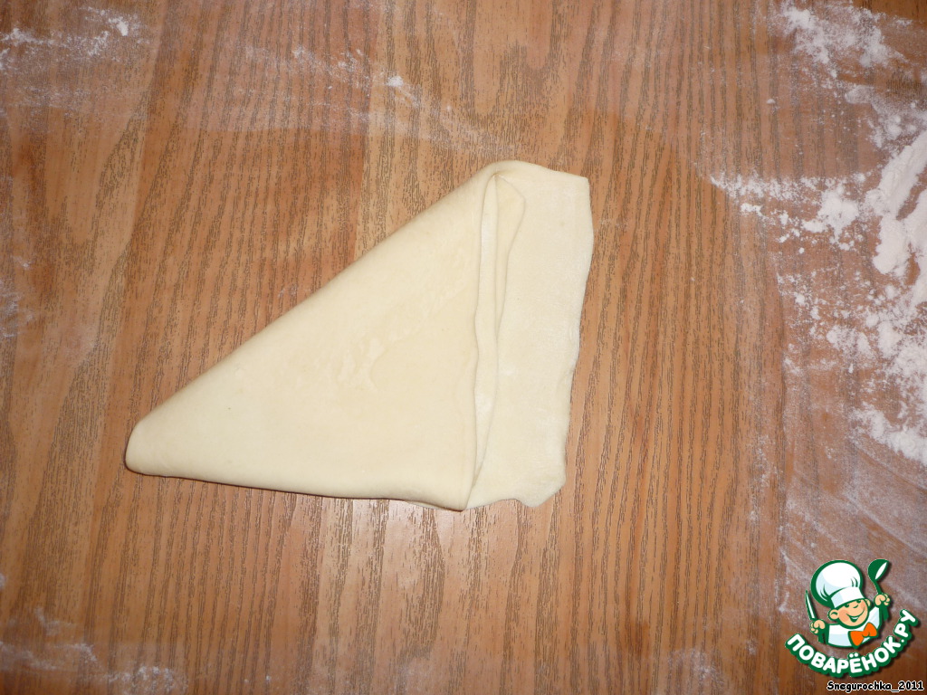 Делаем ещё 5 таких треугольничков. Укладываем на посыпанный мукой противень, смазываем белком и отправляем в нагретую до 200 градусов духовку, до образования румяной корочки.