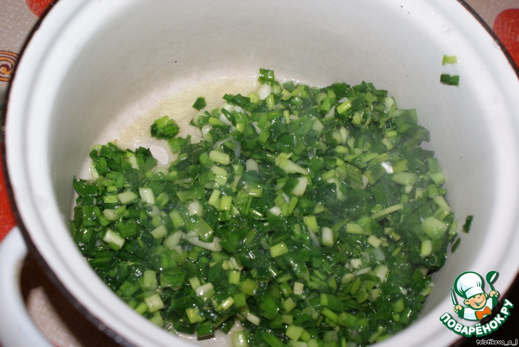 Зеленый лук вымыть, нарезать и обжарить в течение 5 мин.