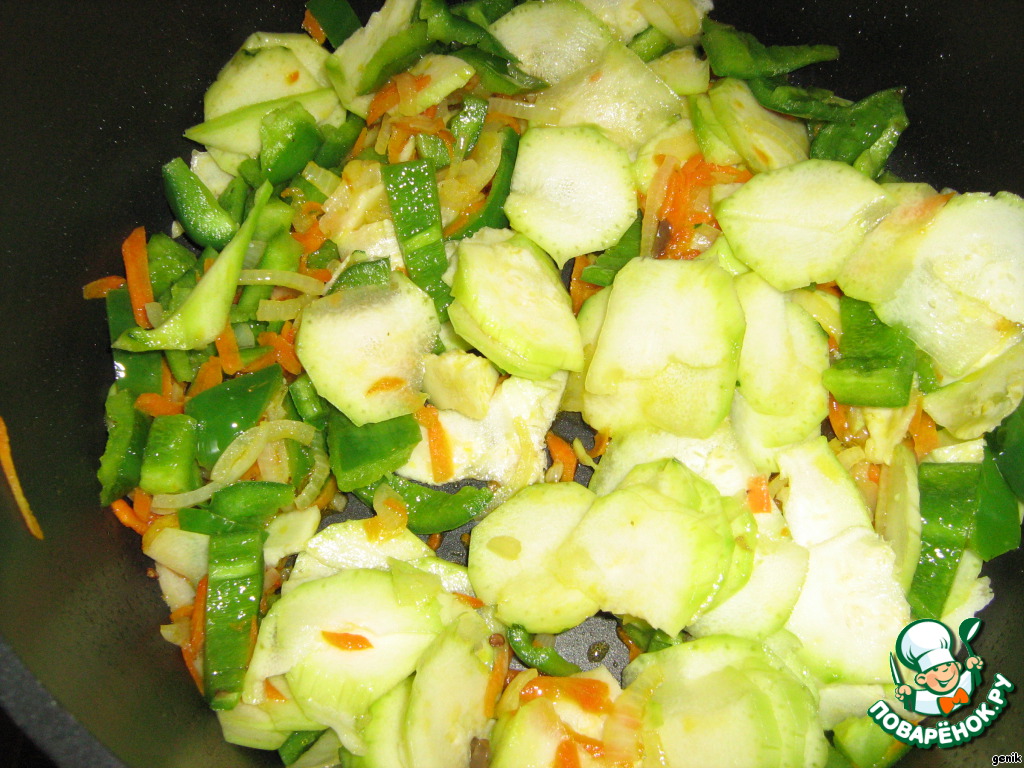 Добавляем очищенные болгарский перец и цуккини, порезанный дольками.Солим, перчим по вкусу, можно добавить укропчика (у меня сухой). Обжариваем. Добавляем грибы свежие или в масле, время тушения зависит от того, какие грибы вы используете. У меня - в масле, так что хватит и 5 мин.