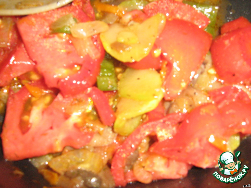 Добавляем помидоры, порезанные кубиками. Перемешиваем начинку. Проверяем на соль и на перец.
