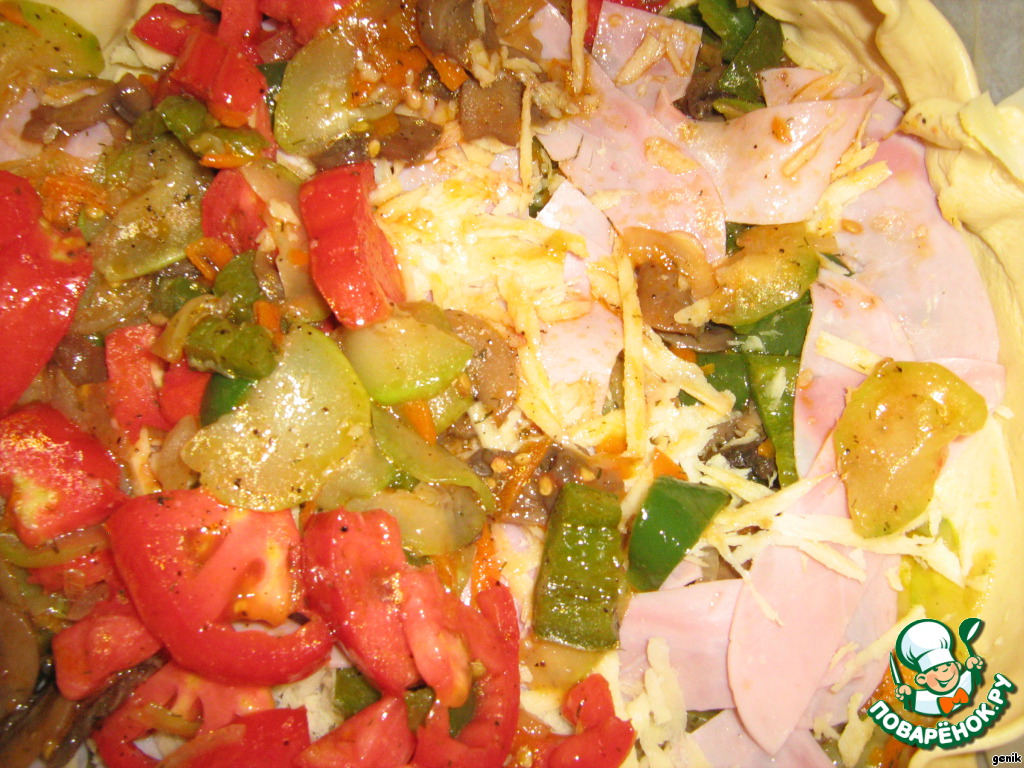 В форму из огнеупорного стекла выкладывем слой слоеного теста (на бумаге), вилкой делаем дырочки в тесте. Выкладываем половину начинки, слой ветчины, порезанной тонкими пластинками, слой тертого сыра. Повторяем слои.
