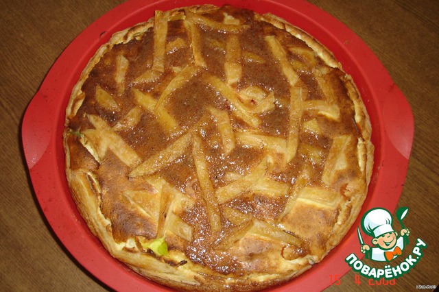 Остатки теста нарезать на полоски и в произвольном порядке разложить по поверхности пирога.