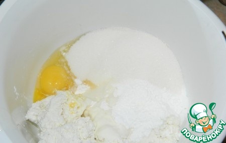 Для приготовления начинки взбить творог, сметану, яйца, сахар, крахмал и ванилин.