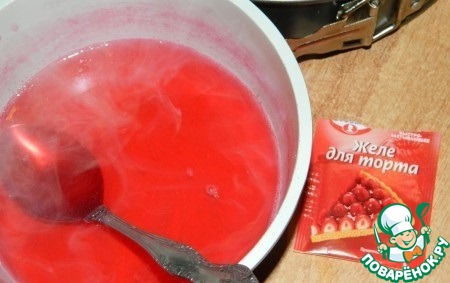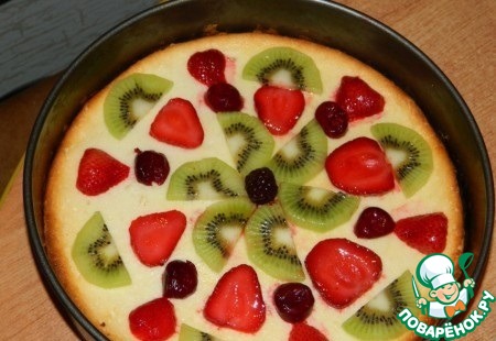 Не снимая бока формы, аккуратно залить пирог горячим желе. Поставить в холодильник на 15 минут. Вкусный творожный пирог с фруктами готов!