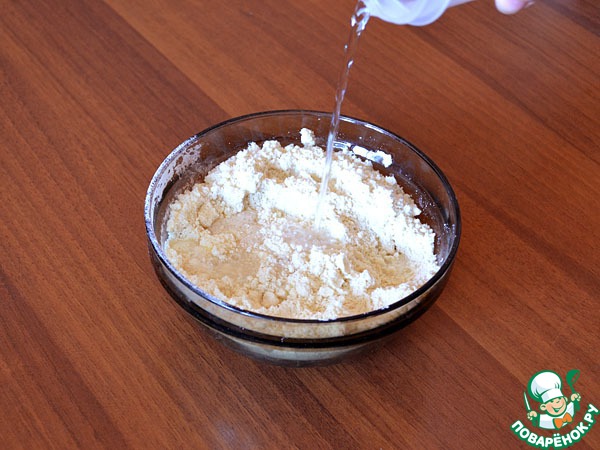Затем добавляем понемногу холодную воду и быстро замешиваем пластичное тесто.