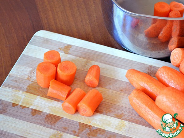 Морковь чистим и режем на бочонки высотой около 3 см. Не переживайте, что они могут получиться чуть разными по высоте, это не повлияет на конечный результат.