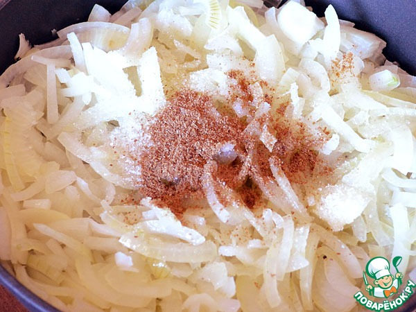 Репчатый лук тонко режем. В толстостенной сковороде растапливаем масло, добавляем лук. Держим лук на маленьком огне под крышкой пару минут, добавляем немного соли, семена фенхеля или молотый кориандр, 1 столовую ложку сахара. Перемешиваем и доводим лук до готовности уже без крышки, чтобы выпарилось больше жидкости.