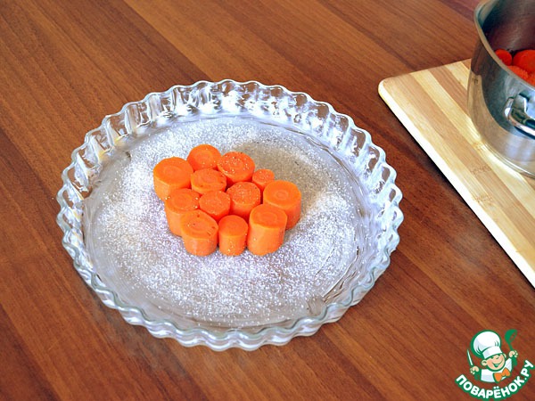 Форму смазываем маслом и посыпаем оставшимся сахаром. Начинаем устанавливать вертикальные бочонки морковки по кругу.