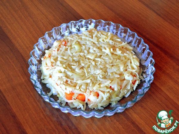 Сверху моркови выкладываем лук, разравниваем. Он, как раз, и заполнит те неровности, которые могли быть допущены при нарезке бочонков.