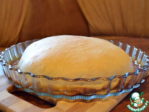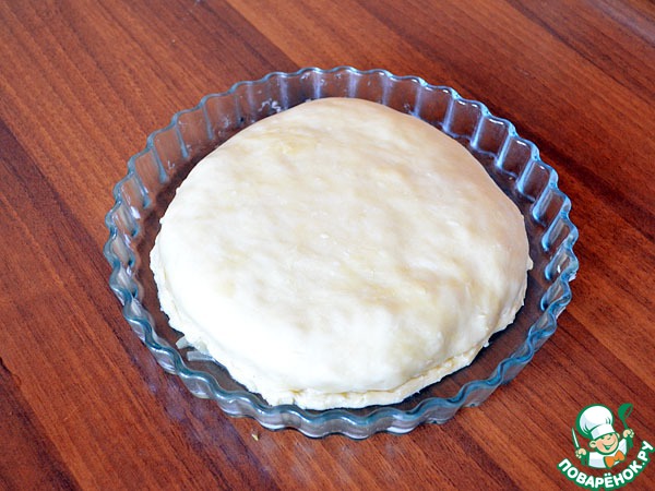 Тесто достаем из холодильника, раскатываем и накрываем им начинку. Стараемся придать пирогу форму и следим, чтобы под тестом оказалось как можно меньше воздуха. Смазываем тесто сверху маслом.