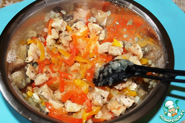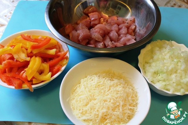 Для начинки. Индейку промываю, обсушиваю полотенцем, нарезаю небольшими кусочками, солю и перчу. Лук мелко нарезаю, перец, очищаю от семян и внутренних перегородок и нарезаю полосками, сыр - натираю на средней терке.