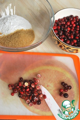 В миске соединить 150 г белого сахара и коричневый. В оригинале рекомендуется использовать мельчайший сахар, либо измельчить сахарный песок в процессоре, что я и сделала. Далее слабонервным не читать :) Клюкву промыть и... нарезать на половинки. Удобнее использовать для этого керамический нож.