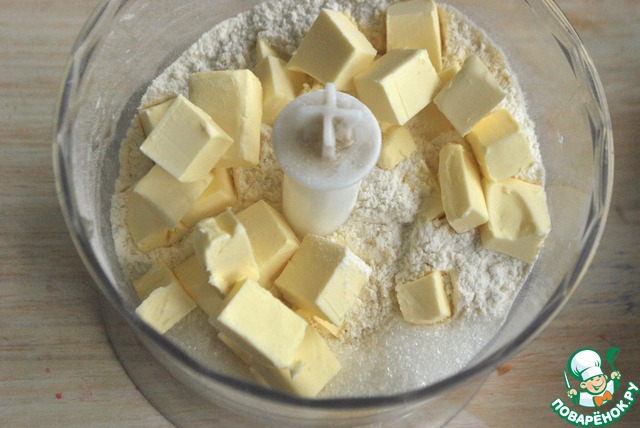 В процессоре соединить муку, соль, 1 ст. ложку сахара и сливочное масло.