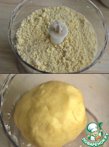 Измельчить до состояния крошки, затем потихоньку добавлять ледяную воду, начиная с 1 ст. ложки, максимум 3 ст. л. Полученное тесто скатать в шар, завернуть в пленку и убрать в холодильник на 1 час.