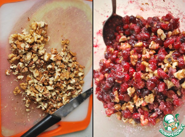 Грецкие орехи порубить на крупные куски. Перемешать с клюквой.