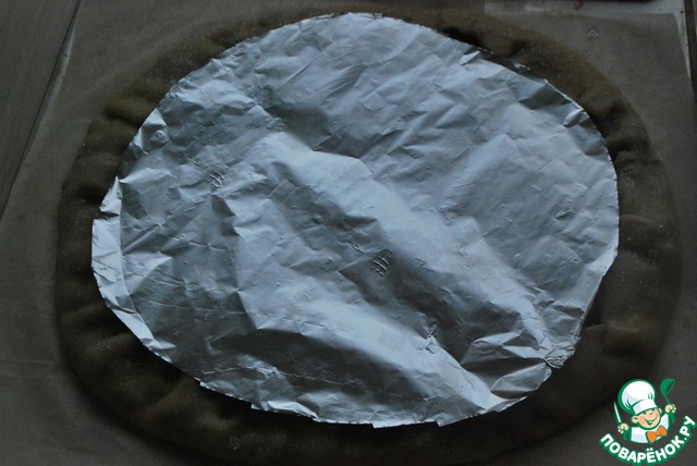 Из фольги вырезать круг диаметром ок.25 см (по размеру открытой начинки), положить сверху. Поставить в разогретую до 210 градусов духовку на 35-40 минут на нижний уровень.