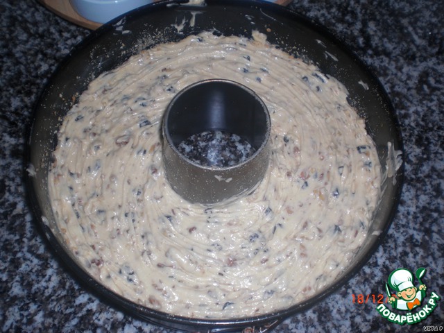 Мягкое масло взбиваем с сахаром до пышной массы, по одному добавляем яйца, муку, порошок и, в самом конце, орехи и изюм. Форму с отверстием смазать маслом, посыпать сухарями и выложить тесто.