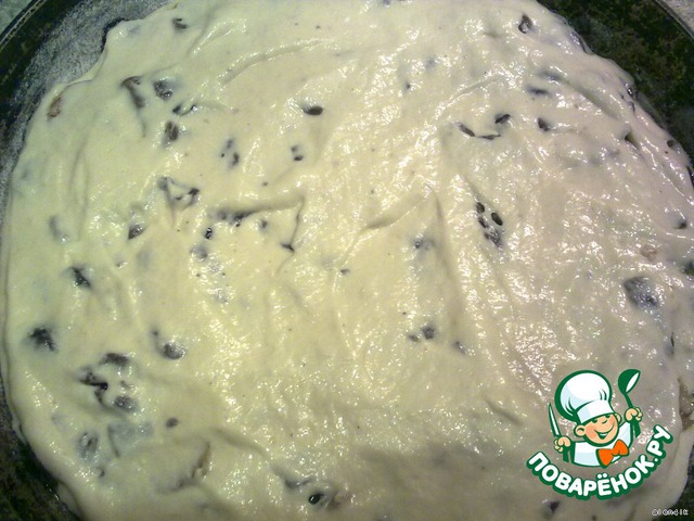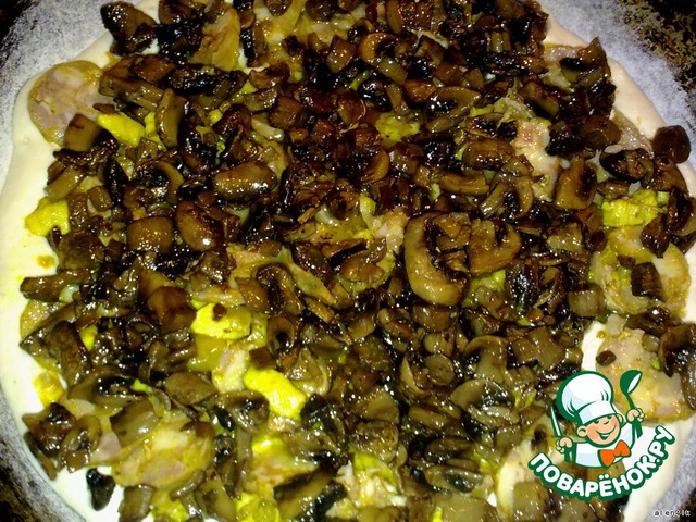 В смазанную маслом и присыпанную мукой форму выкладываем 2/3 теста. Сверху мясную начинку и грибы
