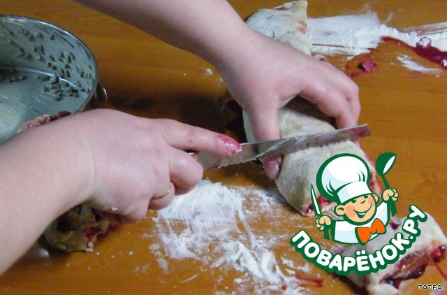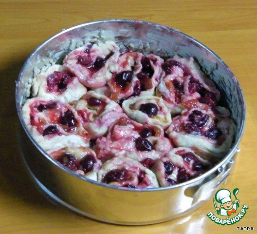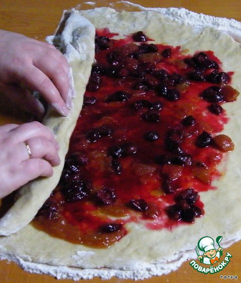 Выложите на пласт начинку и сверните рулетом.Я сначала нанесла варенье ,а затем ягоды, вишни-получилось даже немножко с соком(это видно на фото).Верх немножко посахарила.