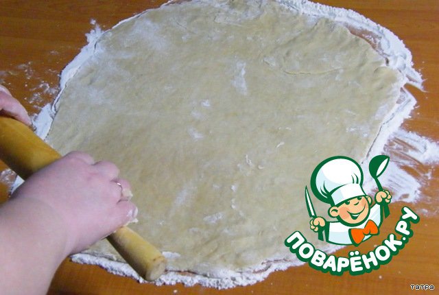 Когда тесто увеличится в 2 раза,раскатайте его прямоугольником толщиной 0.5 см.