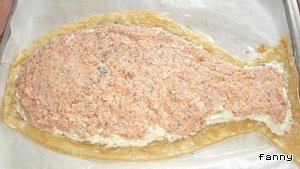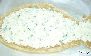 Отступив от краев 1.5 - 2 см. по всему периметру рыбы, обозначить бортики, которые смазать взбитым яйцом, и в дальнейшем начинку на них не выкладывать.