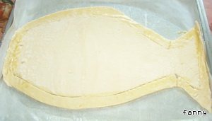 Духовку разогреть до 190°. Примерно из половины (или около 2/3) теста раскатать тоненький лист и вырезать из него силуэт большой рыбы (можно использовать изготовленную из бумаги выкройку).