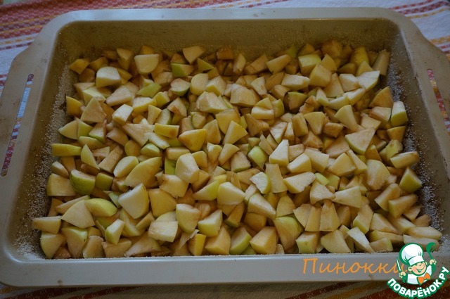 Укладываем в форму яблоки. У меня размеры формы 20/30 см. Вот такое количество примерно получилось. Форму можно застелить пергаментом или смазать маслом и обсыпать манкой.