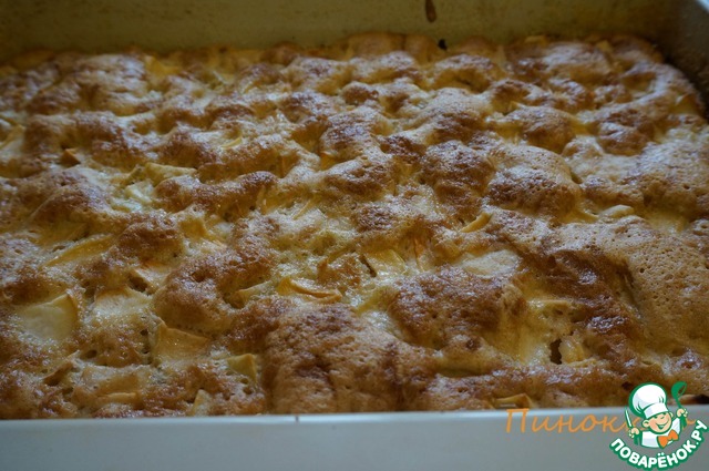 Вот такая моя фамильная шарлотка. Обратите внимание высота готовой шарлотки 2-2,5 см. Не надо стремиться сделать её высокую! Теперь объясню про секреты: антоновские яблоки имеют именно ту консистенцию, которая нужна, что бы в тесте они были мягкими и нежными (шарлотка просто тает во рту!), а так же кислота яблок отлично сочетается с со сладким тестом. Кусочки яблок можно делать и больше по размеру, но эти маленькие кусочки подходят лучше всего! В состав блинной муки входят уже все необходимые компоненты. И вкус получается с блинной мукой совсем другой, чем с обычной. И не забывайте, что яблок должно быть достаточное количество!