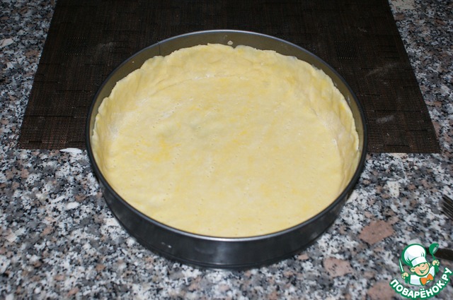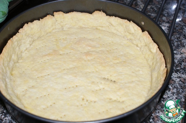 2. Распределяем тесто по форме поднимая борта на 2-2,5 см. накалываем вилкой и отправляем на 15 минут в холодильник.